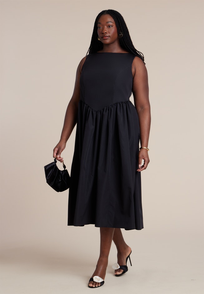 Move with elegance in this taffeta midi dress, where a sculpted bodice and boat neckline meet a gently flared skirt. Try yours with a polished kitten heel & dainty jewels.
