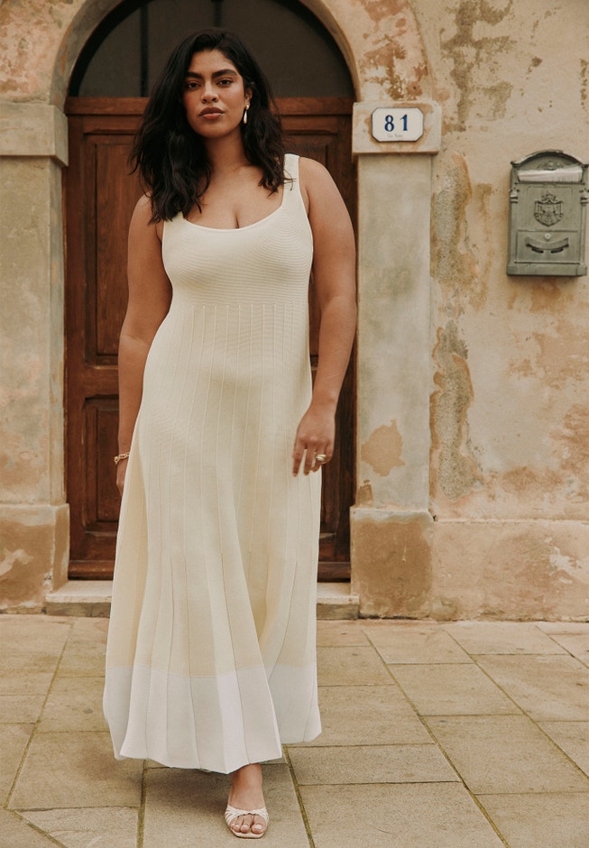 Item Number: 1115432Step into refined comfort with this knit midi dress accented by a contrast hem. A fitted bodice and pleated skirt create effortless, modern elegance.