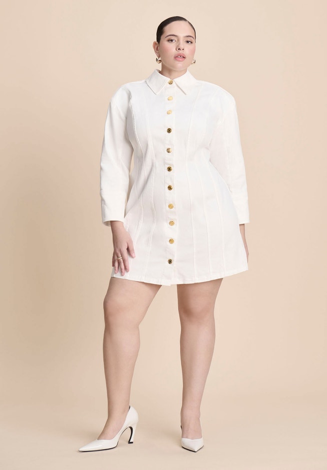 Bring a fashion-forward attitude to denim with this corset mini dress shaped by waist-cinching seaming. The strong shoulders, statement buttons, and stretch-denim create bold, confident appeal.