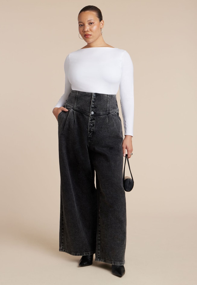 Redefine denim proportions with these wide-leg jeans shaped by a statement corset-inspired waist. A super-high rise and roomy leg shape create bold, fashion-forward confidence.