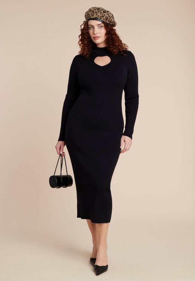 A study in romance, this heart-cutout midi dress pairs a flirty neckline with a contouring fit. Rib knit construction and long sleeves bring a touch of sleek, modern charm.