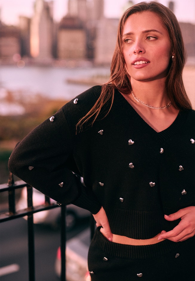 Wear your heart boldly in this embellished sweater, adorned with heart-shaped hardware throughout. A relaxed fit, V-neckline, and cinched cuffs combine everyday comfort with a touch of elevated shine.