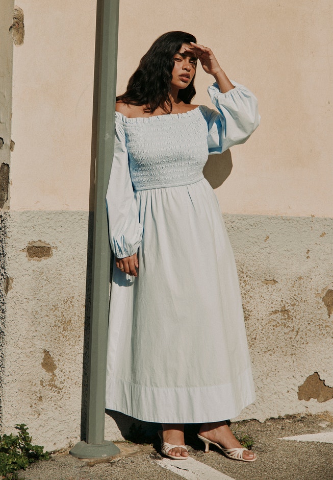 Embrace soft romance in this smocked, off-the-shoulder maxi dress designed to flow effortlessly. Puff sleeves and a dropped waist create graceful movement with modern charm.