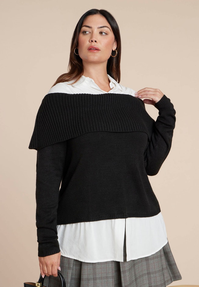 Item Number: 1111490Blur the line between cozy and chic in this off-shoulder twofer sweater. The collared layer, button placket, and ribbed hem create a modern mix of texture and attitude.