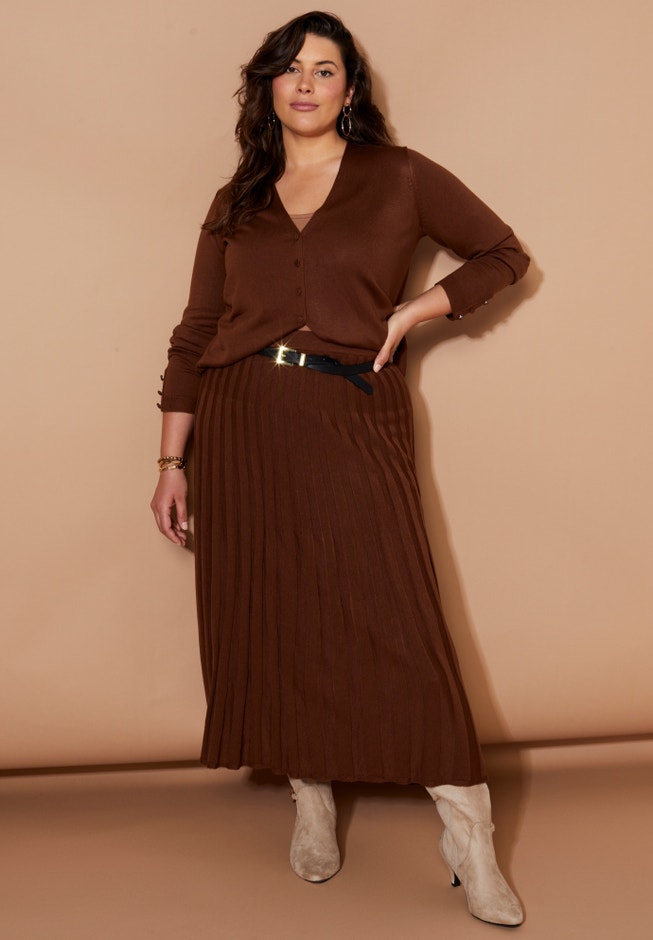 An idyllic balance of softness and structure, this pleated knit midi skirt comes finished with an elastic waistband that offers ease without compromise, inviting wear from morning to moonlight—whether paired with a chunky sweater or your favorite tee.