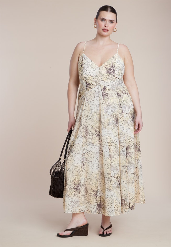 Item Number: 1115456This printed maxi dress is defined by clean lines and adjustable straps for a tailored-to-you fit. A fluid skirt and elongated length create an effortless, composed finish.