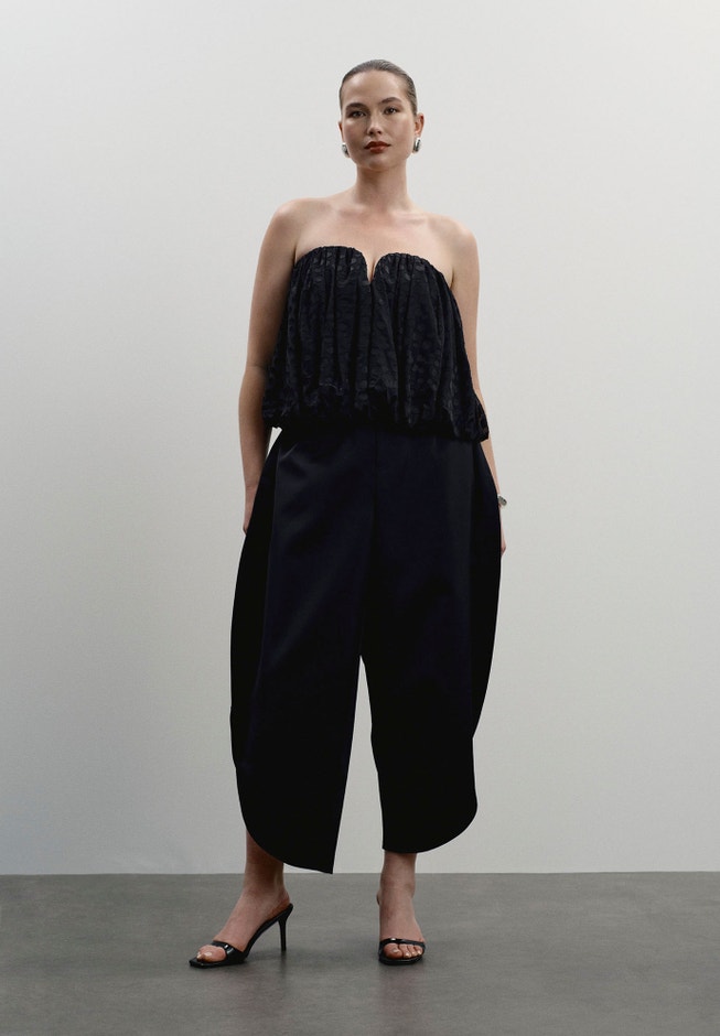 - Cropped, strapless balloon silhouette