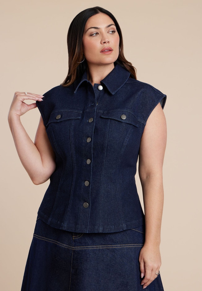 Elevate your top game with this structured denim vest designed to define the waist. A clean button front and sleeveless silhouette give it sharp, contemporary appeal with a Western disposition.