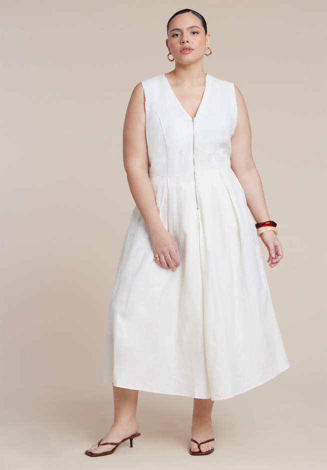 Item Number: 1116512Refresh your warm-weather rotation with this zipper-detail, linen-blend maxi dress designed with tailored seaming. A defined waist and fluid skirt bring composed structure.