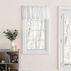 A white polyester valance with brush fringe, featuring a 1.5" rod pocket and header.